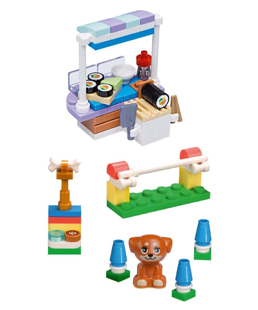 In questa uscita trovi 2 Set LEGO: STAND DEL SUSHI + CUCCIOLO DI ALIYA CON AREA GIOCHI, per creare storie sempre nuove a Heartlake City.
